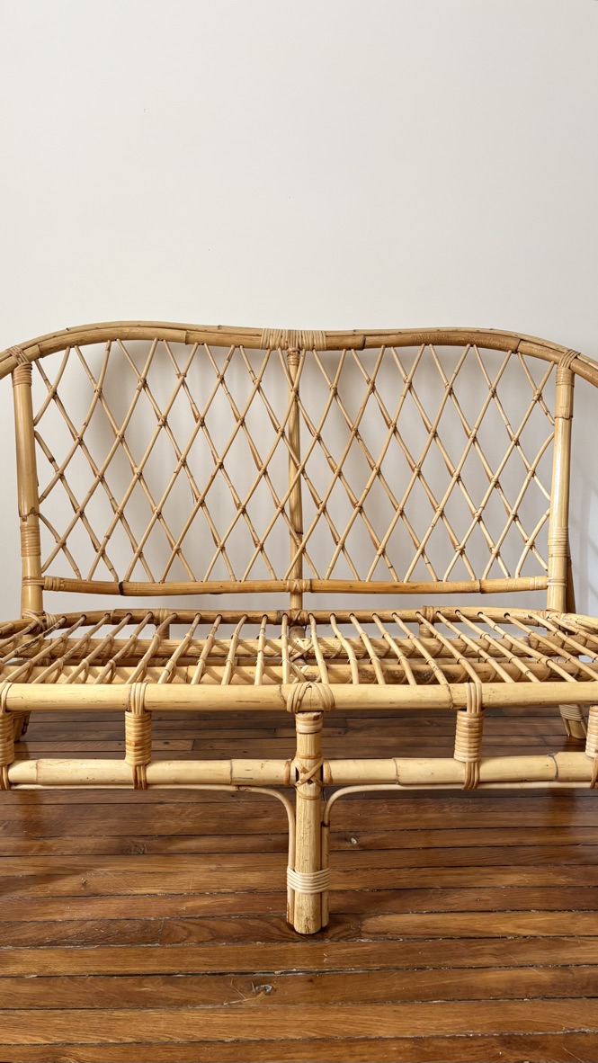 Charmant canapé deux places en rotin datant des années 1970, au style authentique et intemporel. Sa structure en rotin aux lignes arrondies apportera une touche chaleureuse et naturelle à votre intérieur, parfaite pour une décoration bohème, vintage ou bord de mer. Solide et confortable, il peut être utilisé tel quel ou agrémenté de coussins selon vos envies. État: bon état général avec quelques traces du temps qui témoignent de son histoire et de son authenticité. À noter: pour les amoureux du vintage uniquement ! Ce canapé n’est pas neuf et peut présenter de légères marques d’usage liées à son âge. Une belle pièce de caractère pour donner du cachet à votre intérieur.